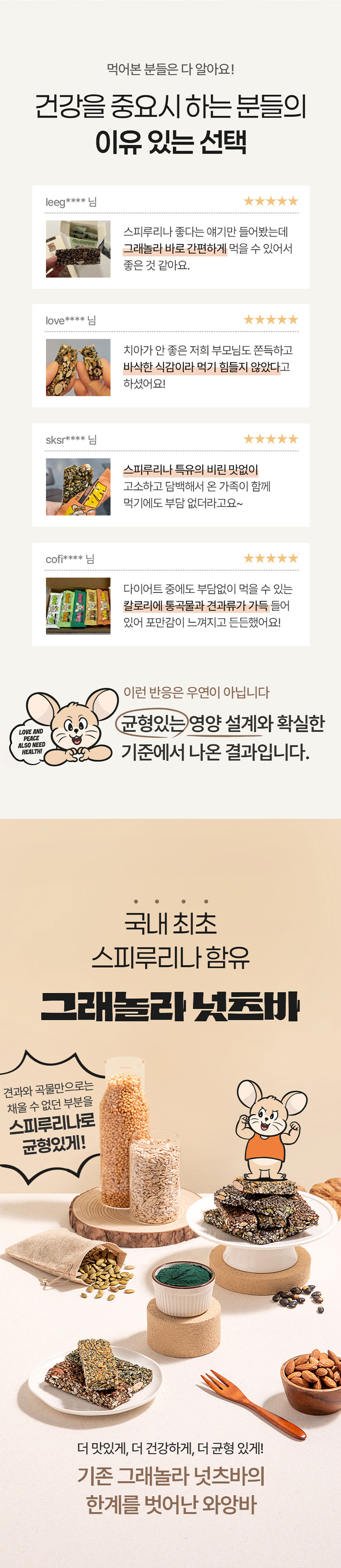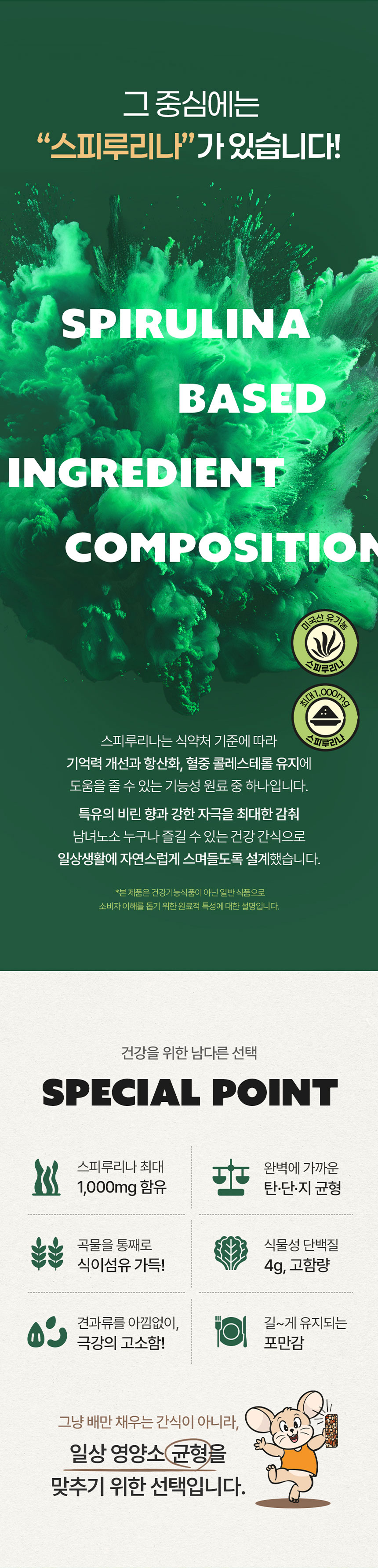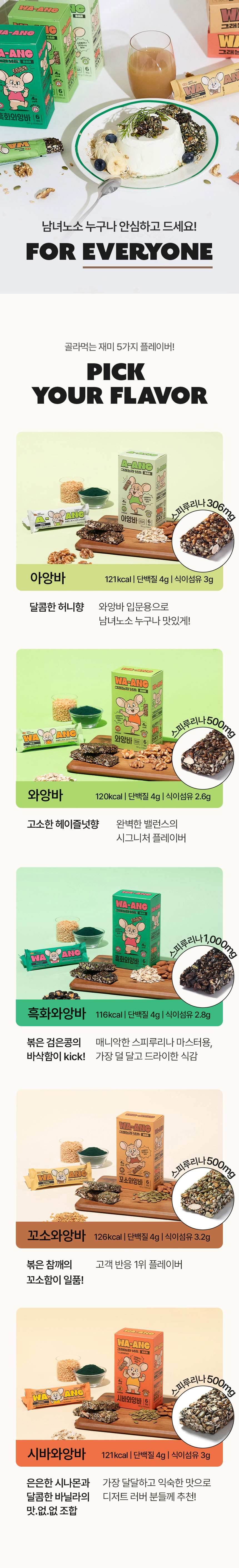 | 메디다이닝 영양 위원회 한 줄 평 | 스피루리나는 특유의 맛과 향으로 섭취하기 어려울 수도 있는데, 견과바로 재탄생해 먹기 좋은 건강식이 되었어요. 스피루리나가 처음이라면, 아앙바부터 시작해보세요! *스피루리나 함량 : 아앙바 306mg < 와앙바, 꼬소와앙바, 시바와앙바 500mg < 흑화와앙바 1,000mg (바 1개당/25g) |