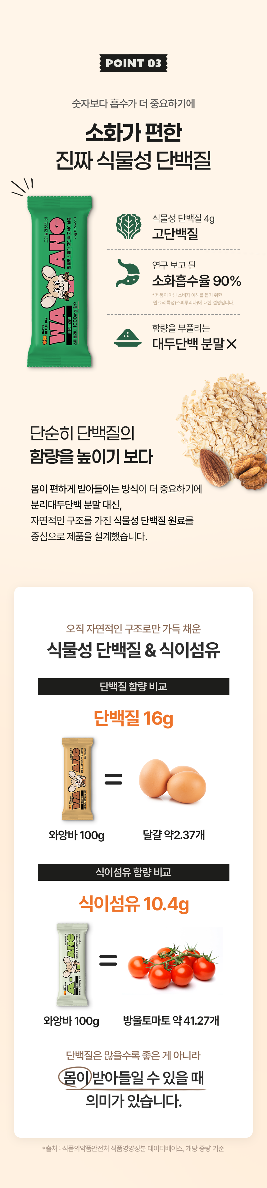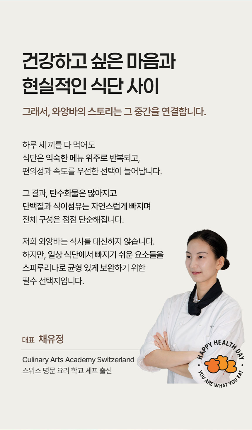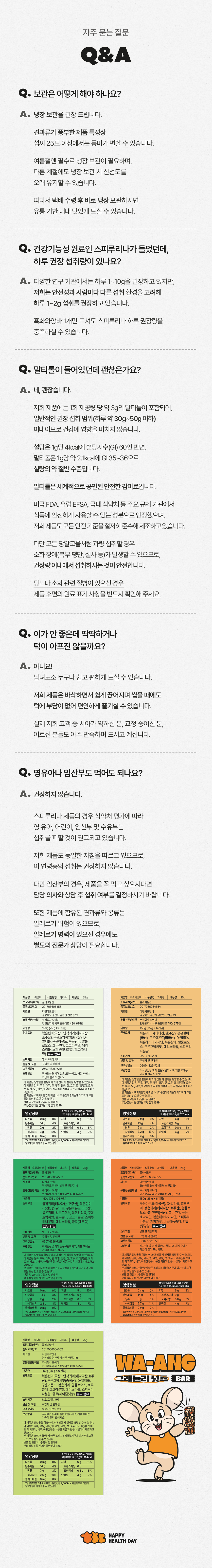 | 메디다이닝 영양 위원회 한 줄 평 | 스피루리나는 특유의 맛과 향으로 섭취하기 어려울 수도 있는데, 견과바로 재탄생해 먹기 좋은 건강식이 되었어요. 스피루리나가 처음이라면, 아앙바부터 시작해보세요! *스피루리나 함량 : 아앙바 306mg < 와앙바, 꼬소와앙바, 시바와앙바 500mg < 흑화와앙바 1,000mg (바 1개당/25g) |